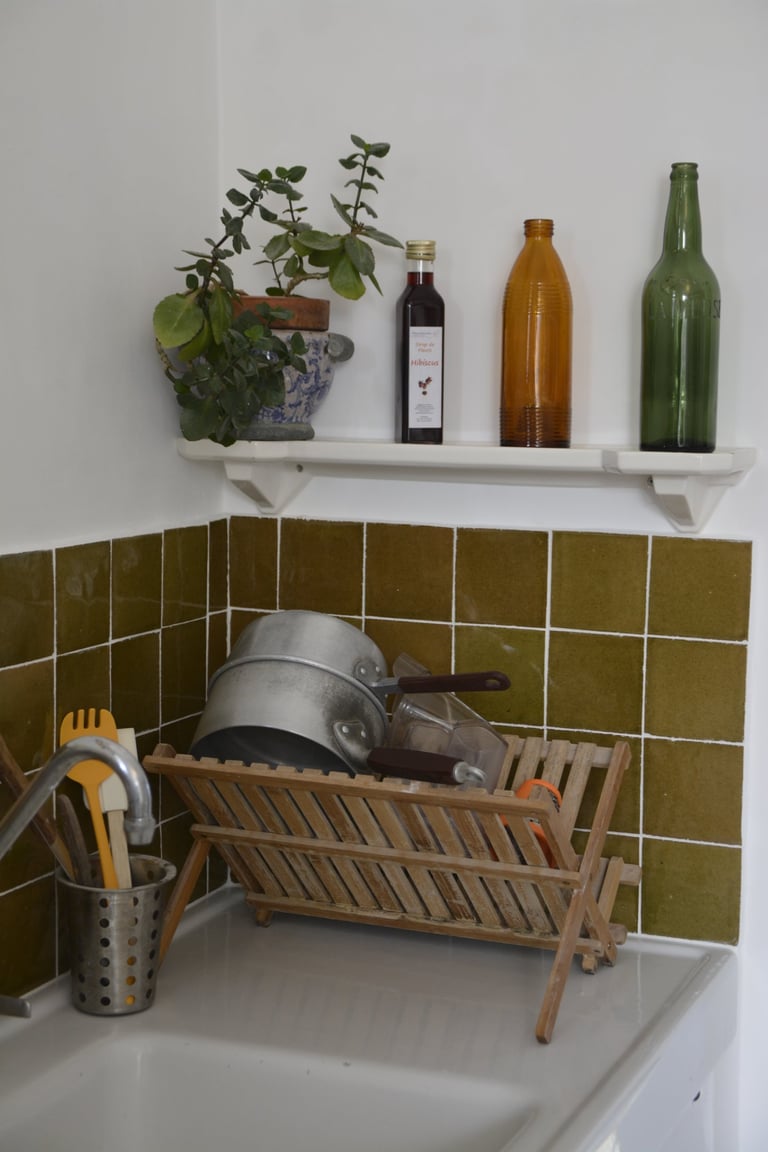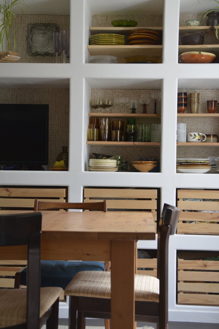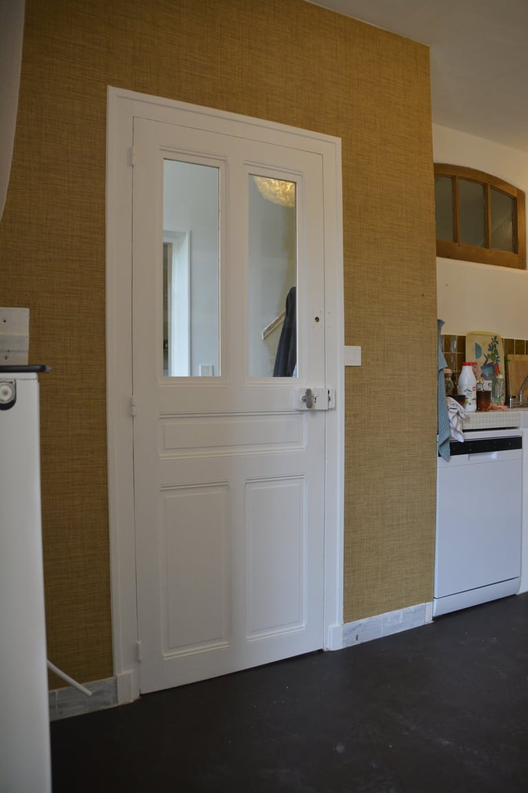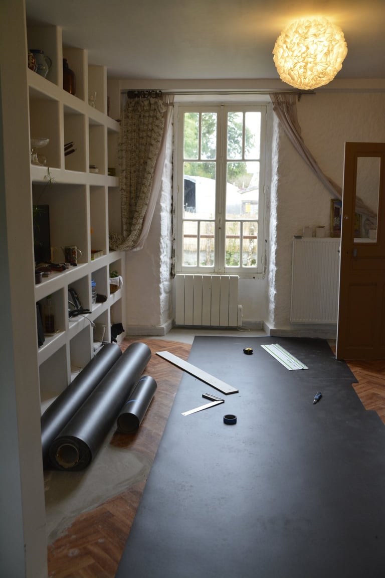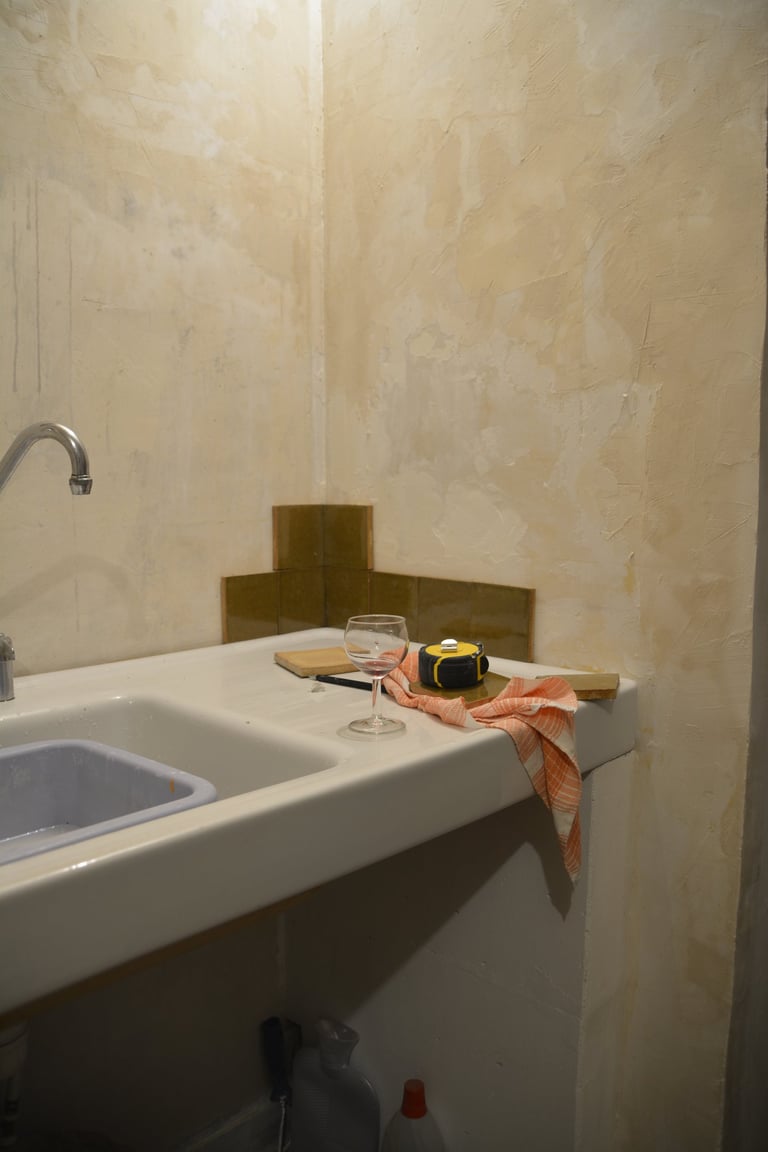 Transformer une pièce sans point d'eau en cuisine, créer un mur "niches" en siporex, dans lequel inclure un frigo, ainsi que de l'éclairage. Installer un évier ancien chiné en brocante, ainsi que deux ouvertures grâce à deux impostes en chêne. Faire un ragréage et poser un sol linoléum.