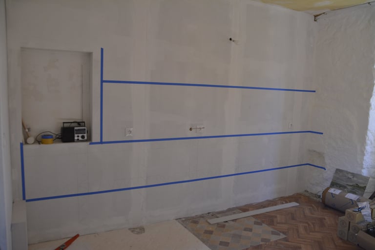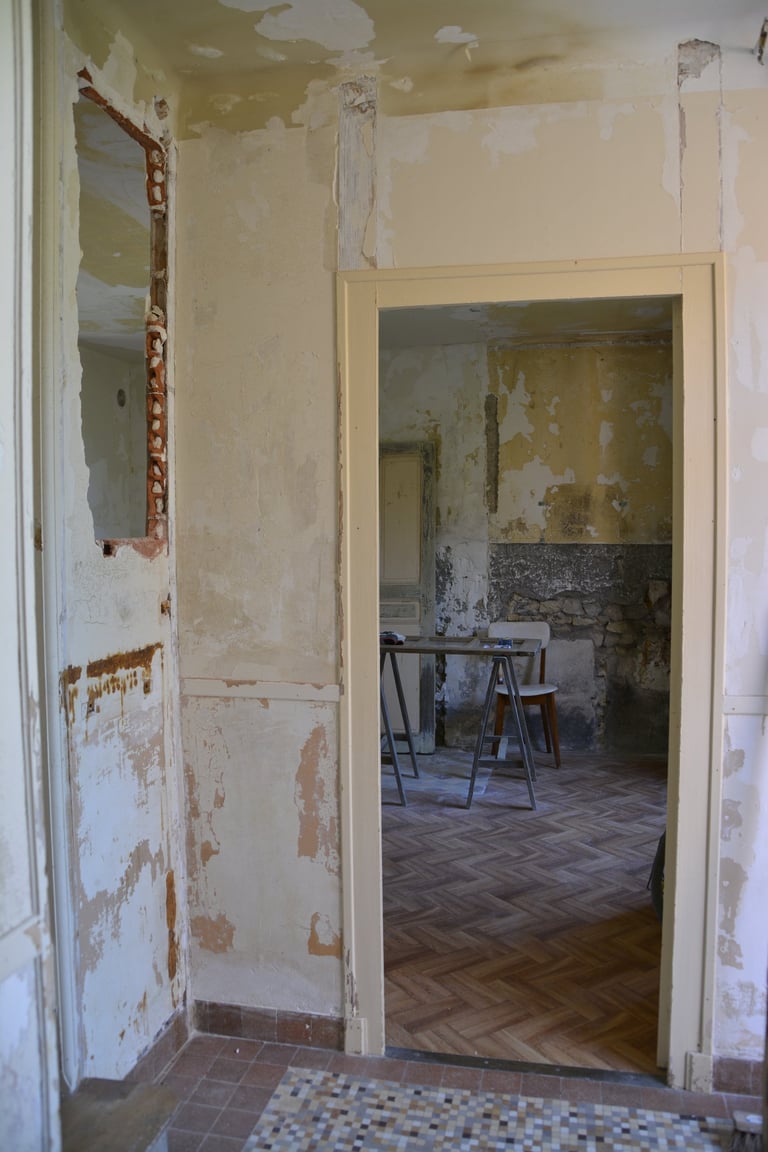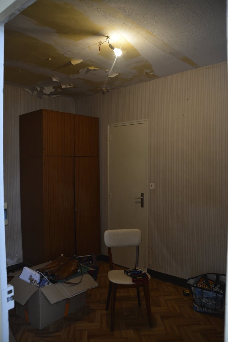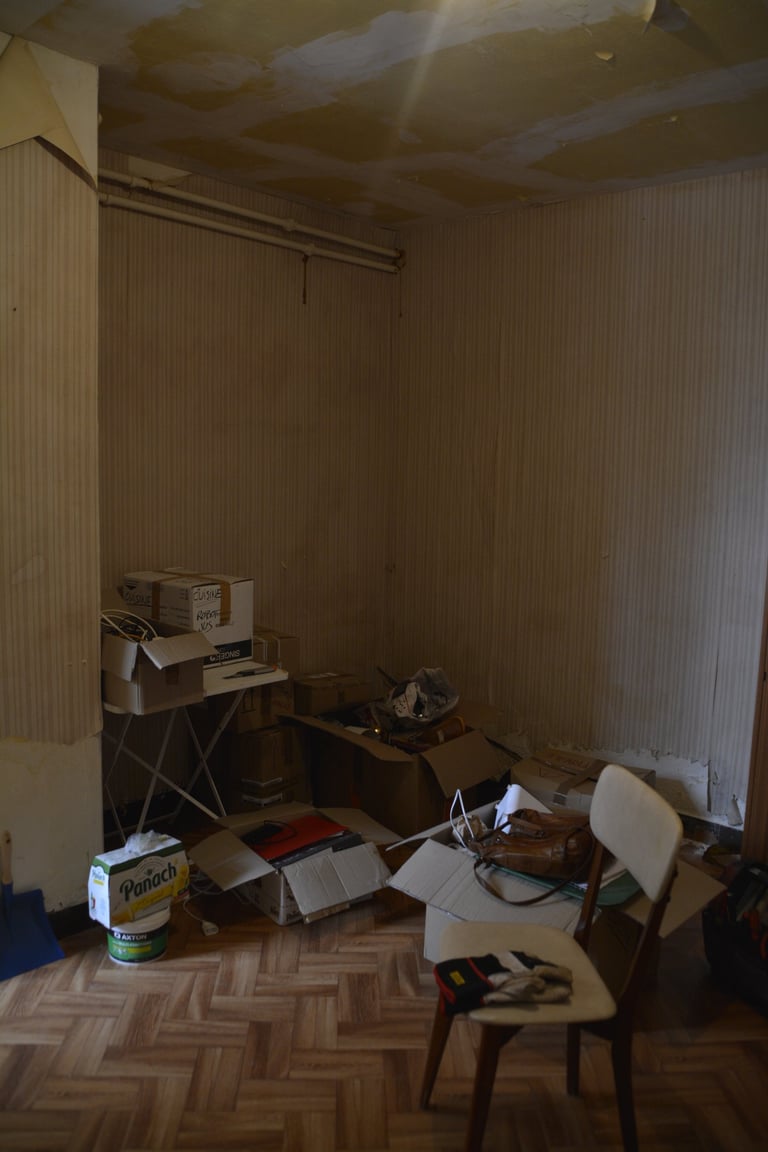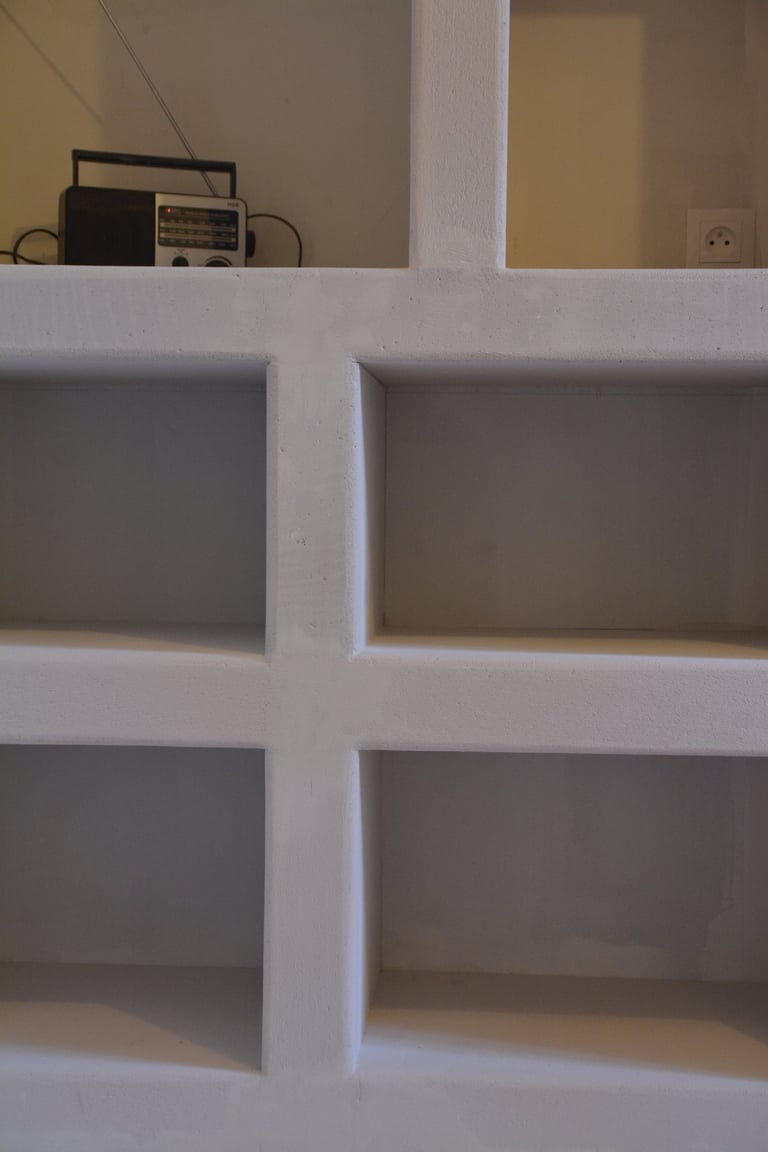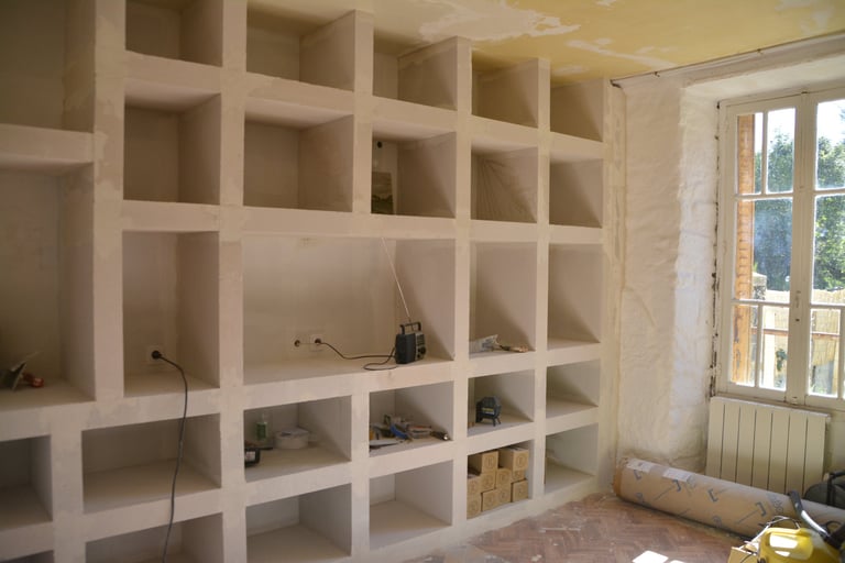 Transformer une pièce sans point d'eau en cuisine, créer un mur "niches" en siporex, dans lequel inclure un frigo, ainsi que de l'éclairage. Installer un évier ancien chiné en brocante, ainsi que deux ouvertures grâce à deux impostes en chêne. Faire un ragréage et poser un sol linoléum.