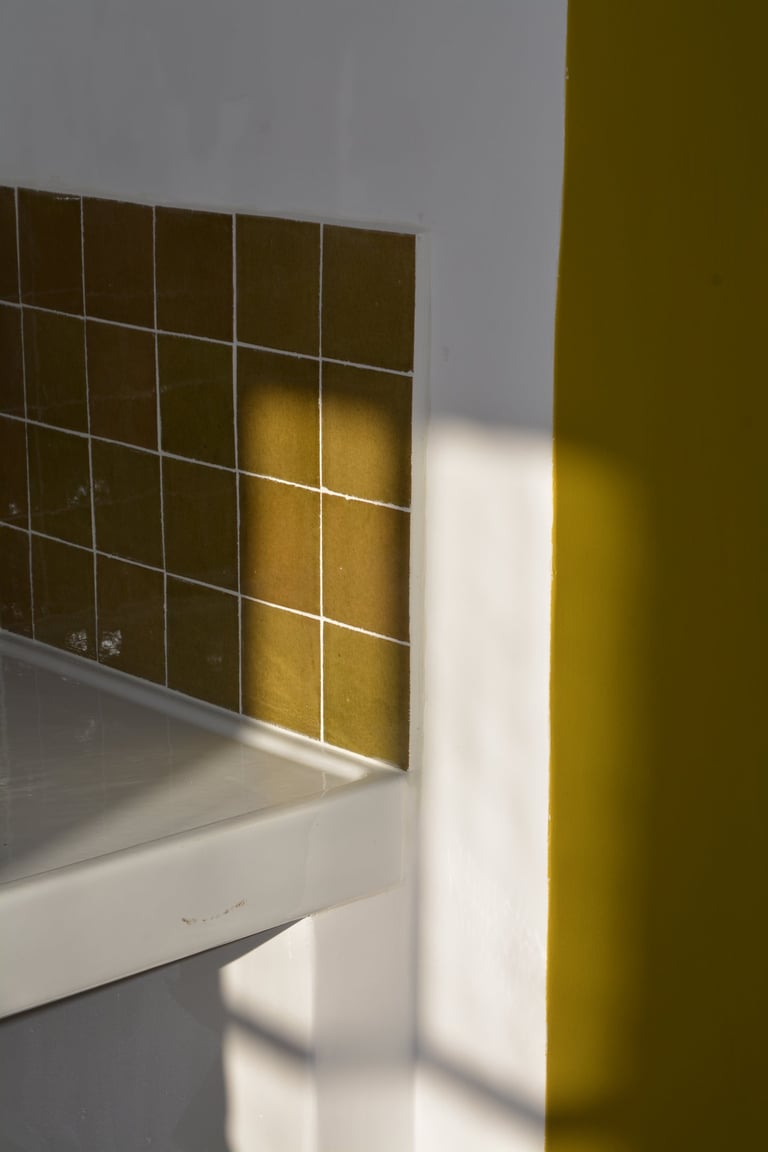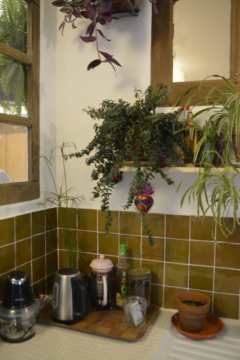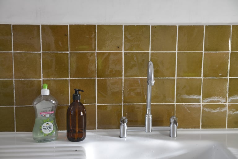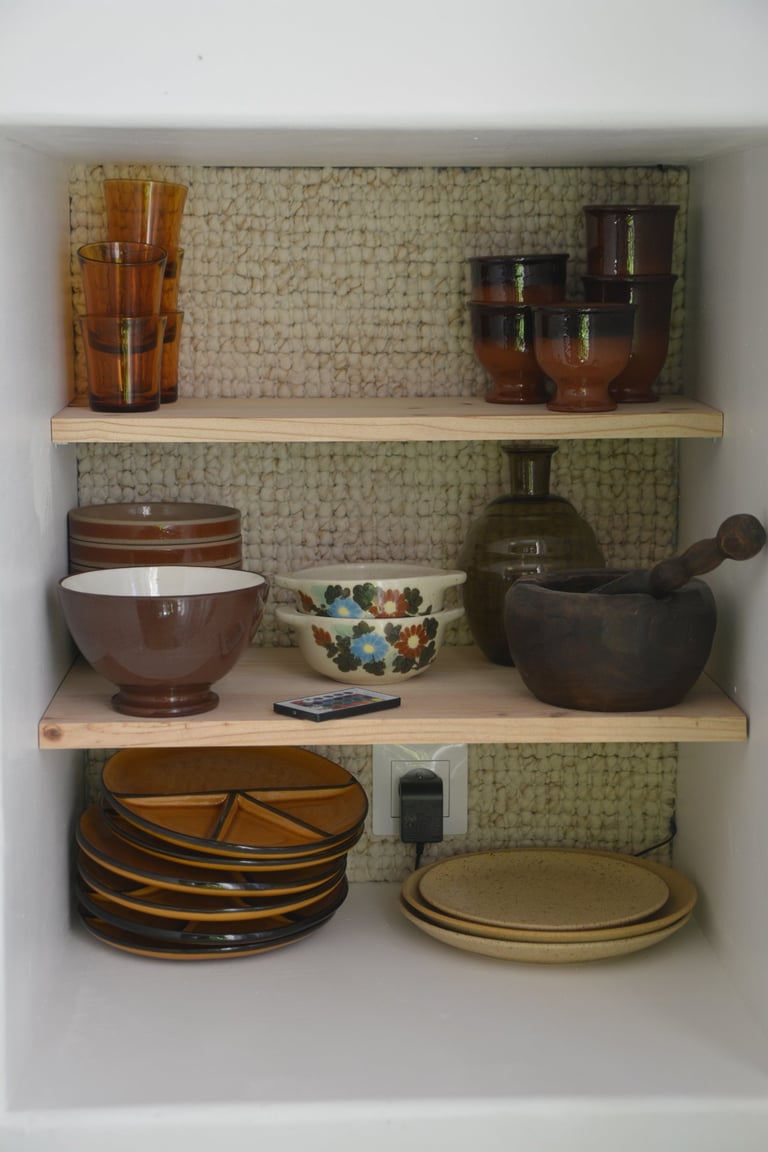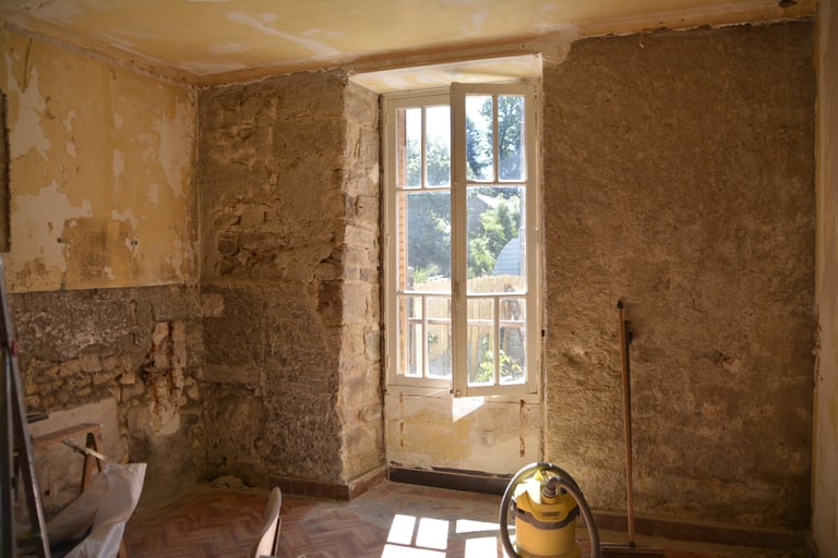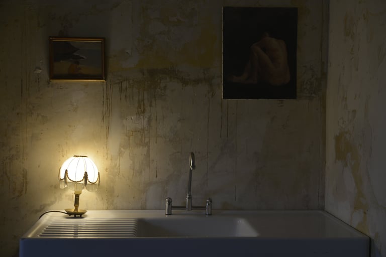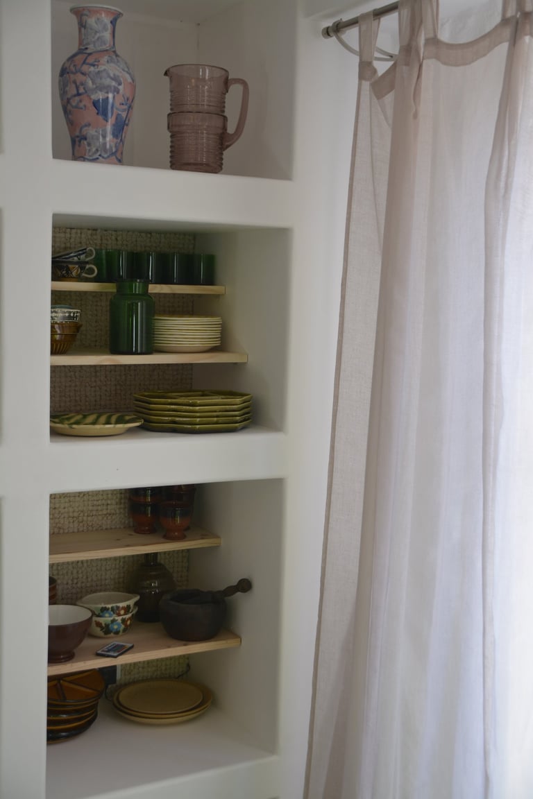Transformer une pièce sans point d'eau en cuisine, créer un mur "niches" en siporex, dans lequel inclure un frigo, ainsi que de l'éclairage. Installer un évier ancien chiné en brocante, ainsi que deux ouvertures grâce à deux impostes en chêne. Faire un ragréage et poser un sol linoléum.
