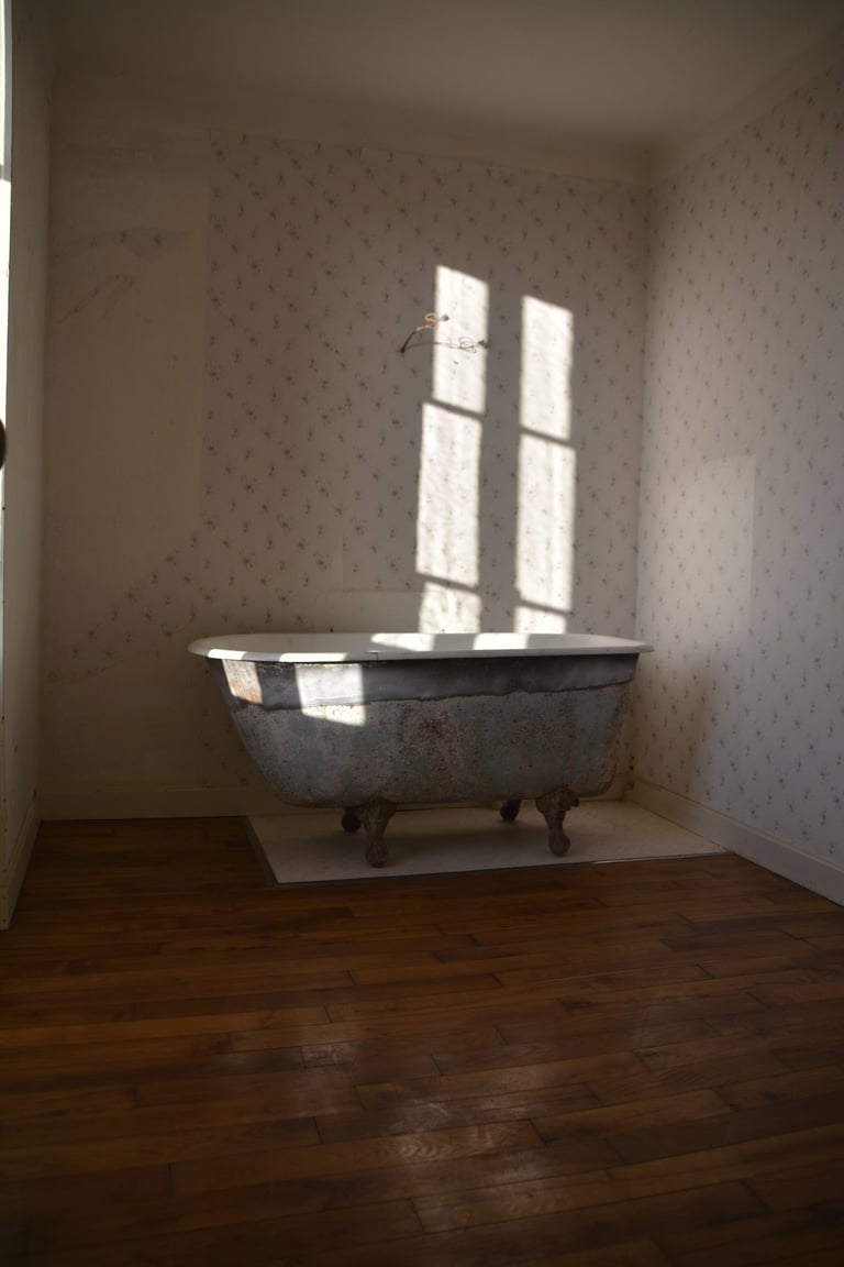 La baignoire ancienne à pattes de lion a été émaillée par Alexandre, mais Aurélie a souhaité que l'on ne touche pas à son apparence extérieure, patinée par les années passées dehors. Un fixateur a donc stabilisé son état, permettant d'apprécier les teintes bleutées de sa patine sans se désagréger.