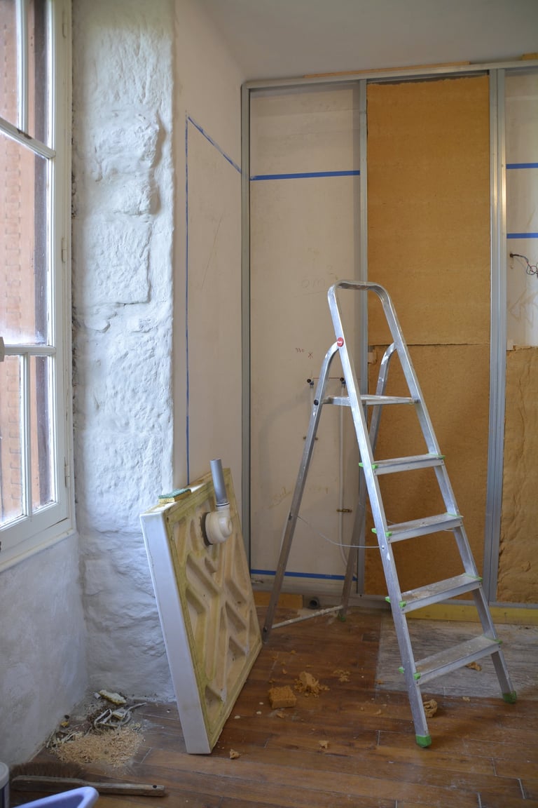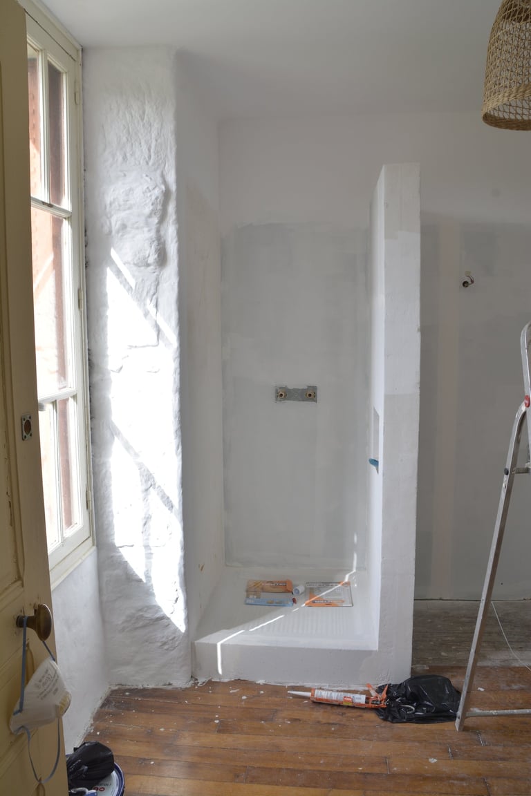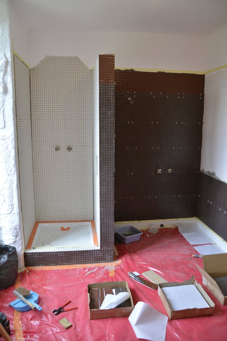 Transformer une pièce de 10m² en salle de bain, avec douche et baignoire. Transformer un meuble de métier ancien en meuble vasque. Une moquette en laine très résistante à l'eau a été posée sur le parquet afin de le protéger.