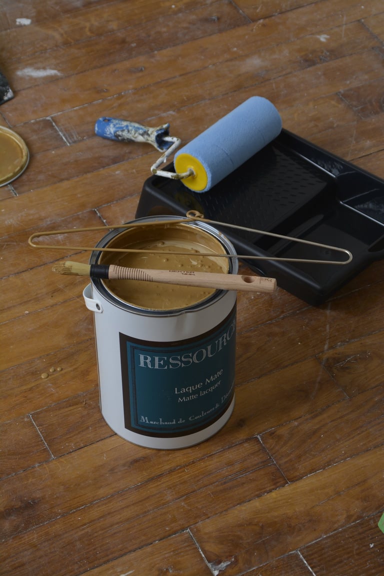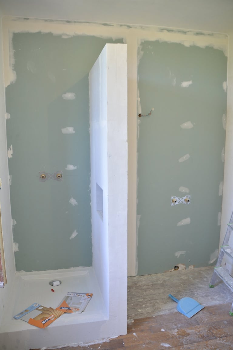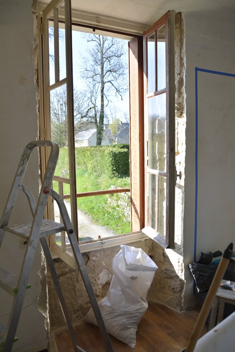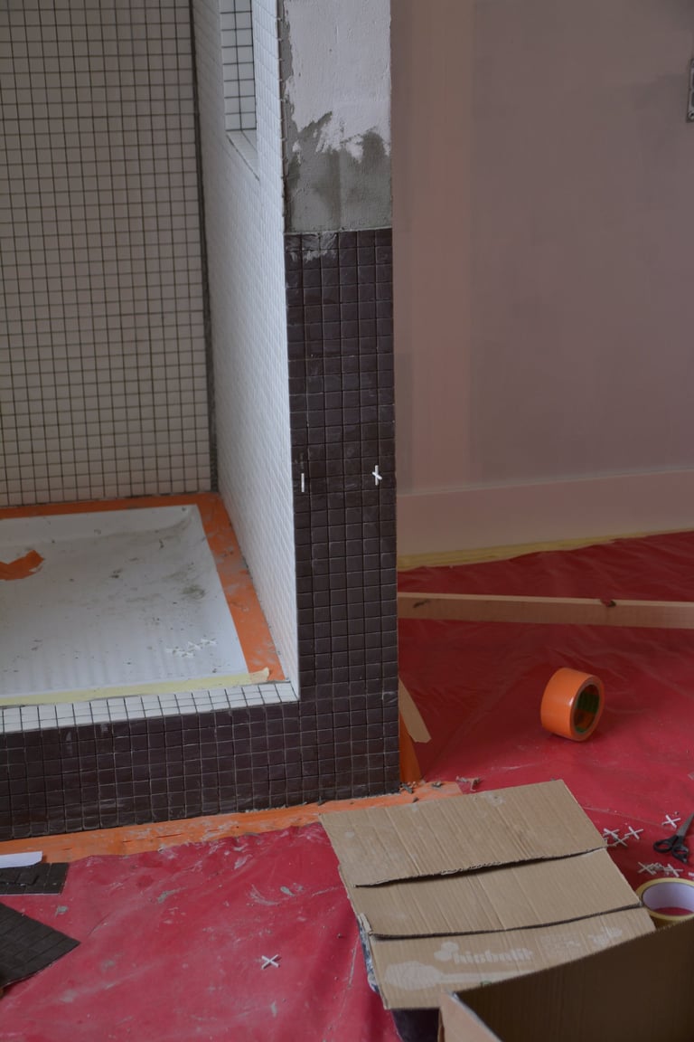 Transformer une pièce de 10m² en salle de bain, avec douche et baignoire. Transformer un meuble de métier ancien en meuble vasque. Une moquette en laine très résistante à l'eau a été posée sur le parquet afin de le protéger.