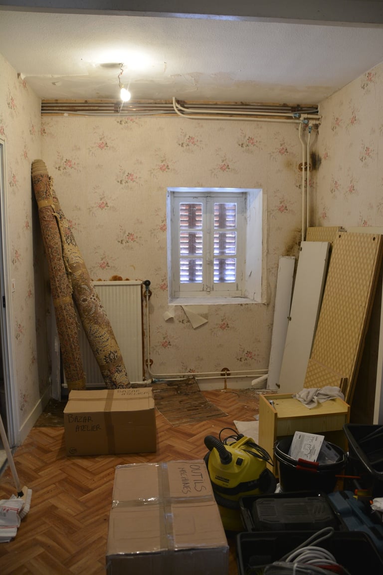 Organiser totalement un espace qui était une pièce avec salle d'eau au rez de chaussée de la maison. Suppression des points d'eau, isolation complète de la pièce, murs et sol; laine de bois et liège.
