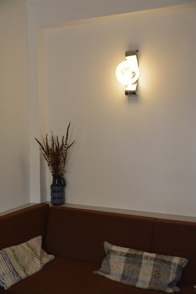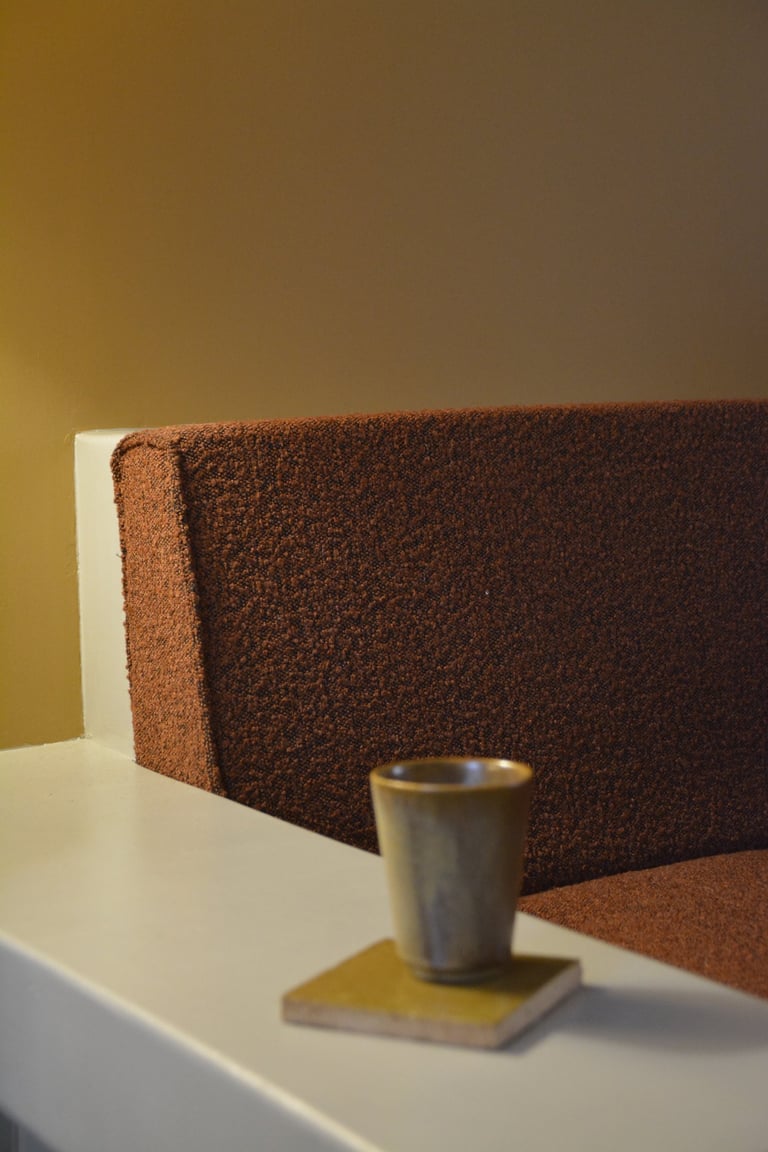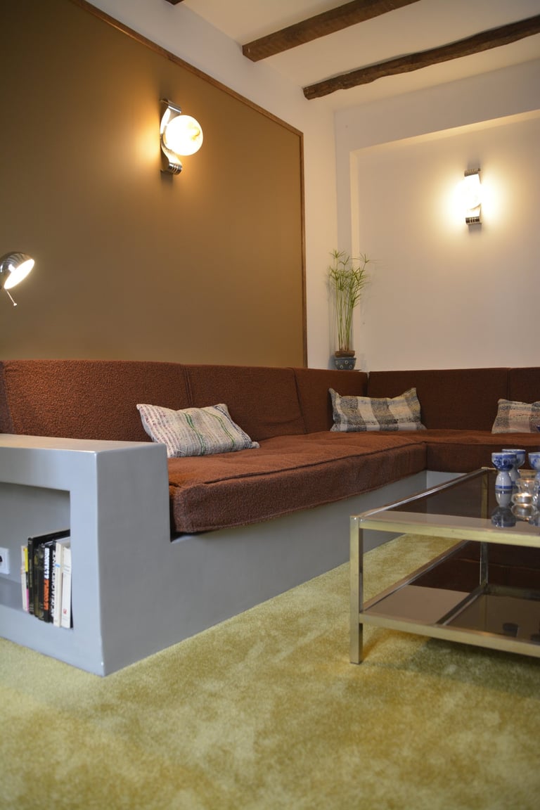 Bibliothèque crémaillères, création d'un canapé en siporex, mosaïque au mur autour de la fenêtre pour une touche de gaieté et d'originalité.